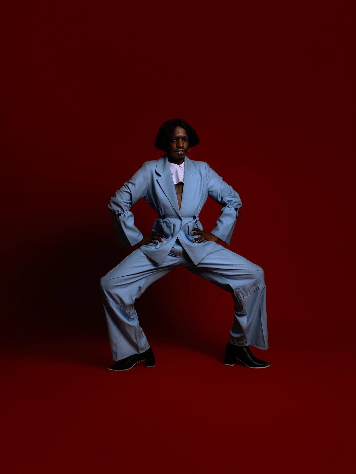 Desire in the Powder Blue Draw-Cord Power Suit from THEBE MAGUGU SS19, "Art History"