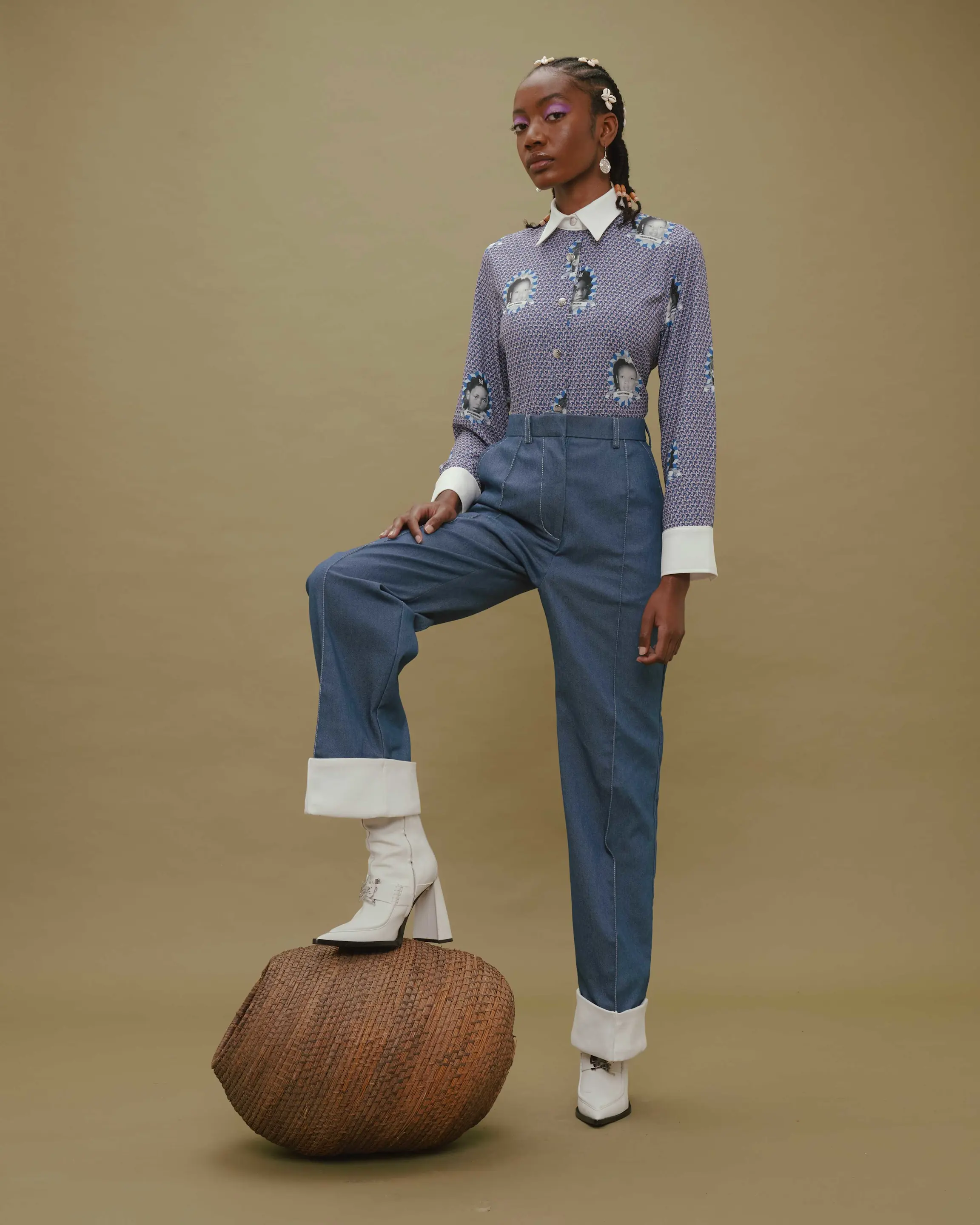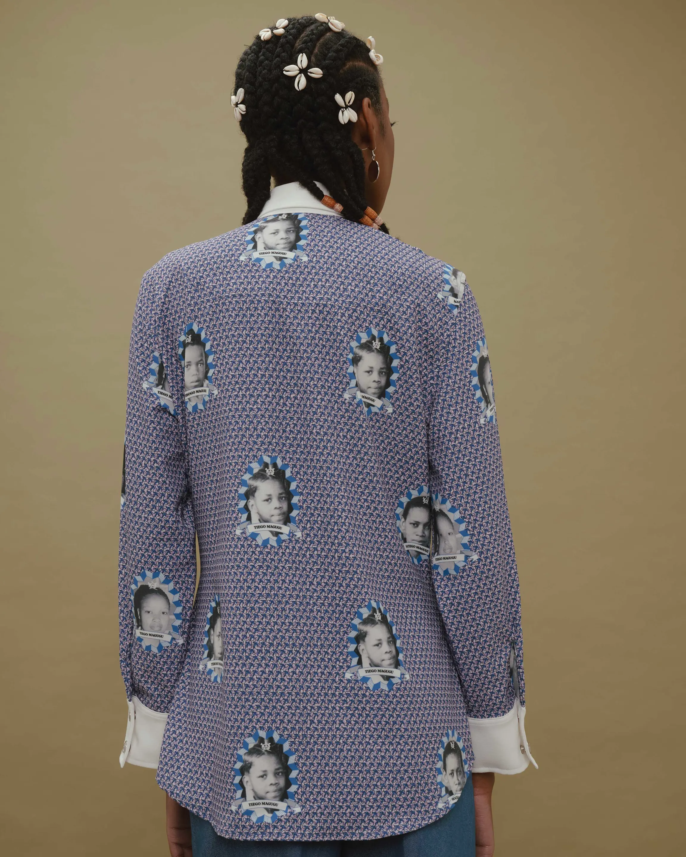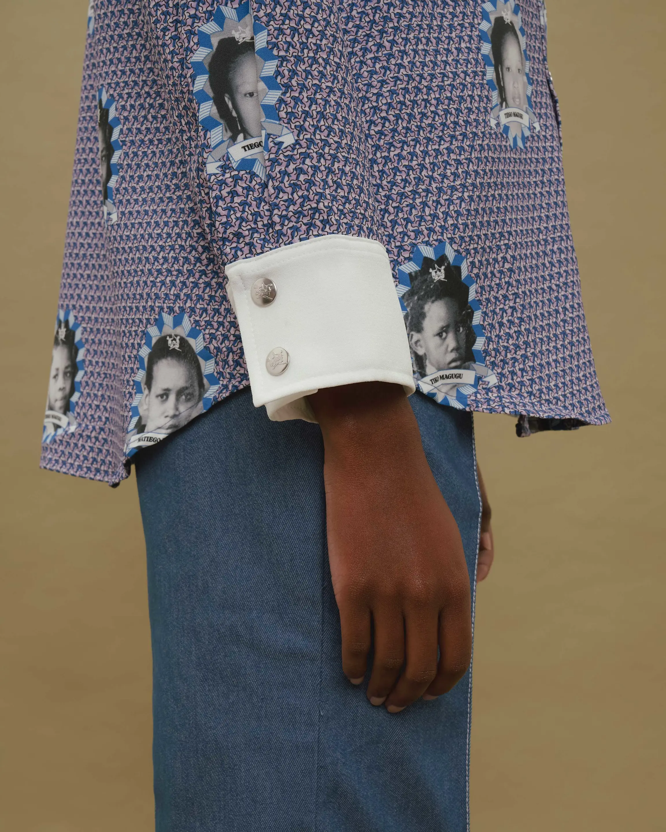 This Heirloom semi-fitted moss crepe blouse features contrast collar and cuffs made in a shweshwe inspired print clad in regal images of the Magugu family. Topped with stainless Steel press studs.