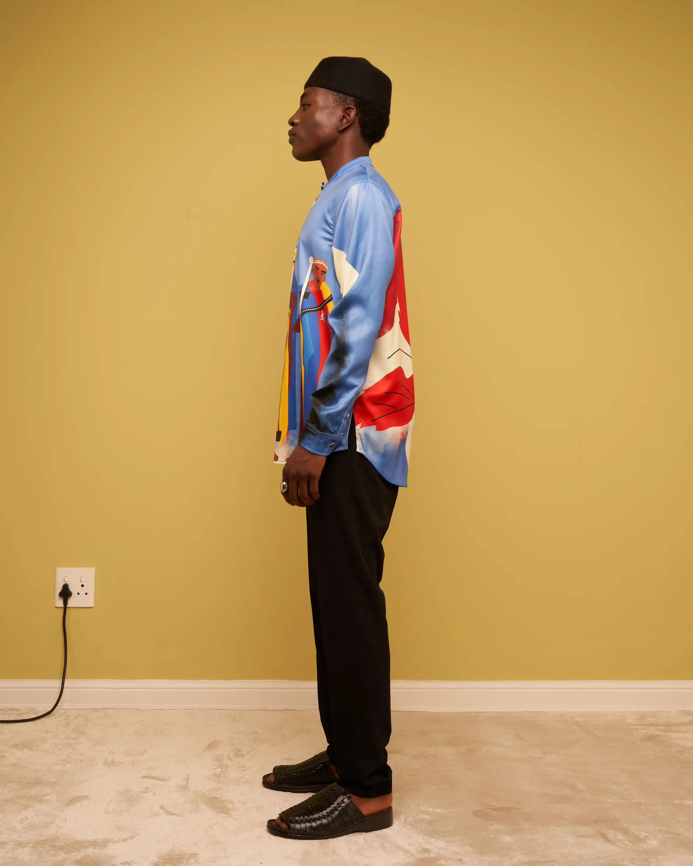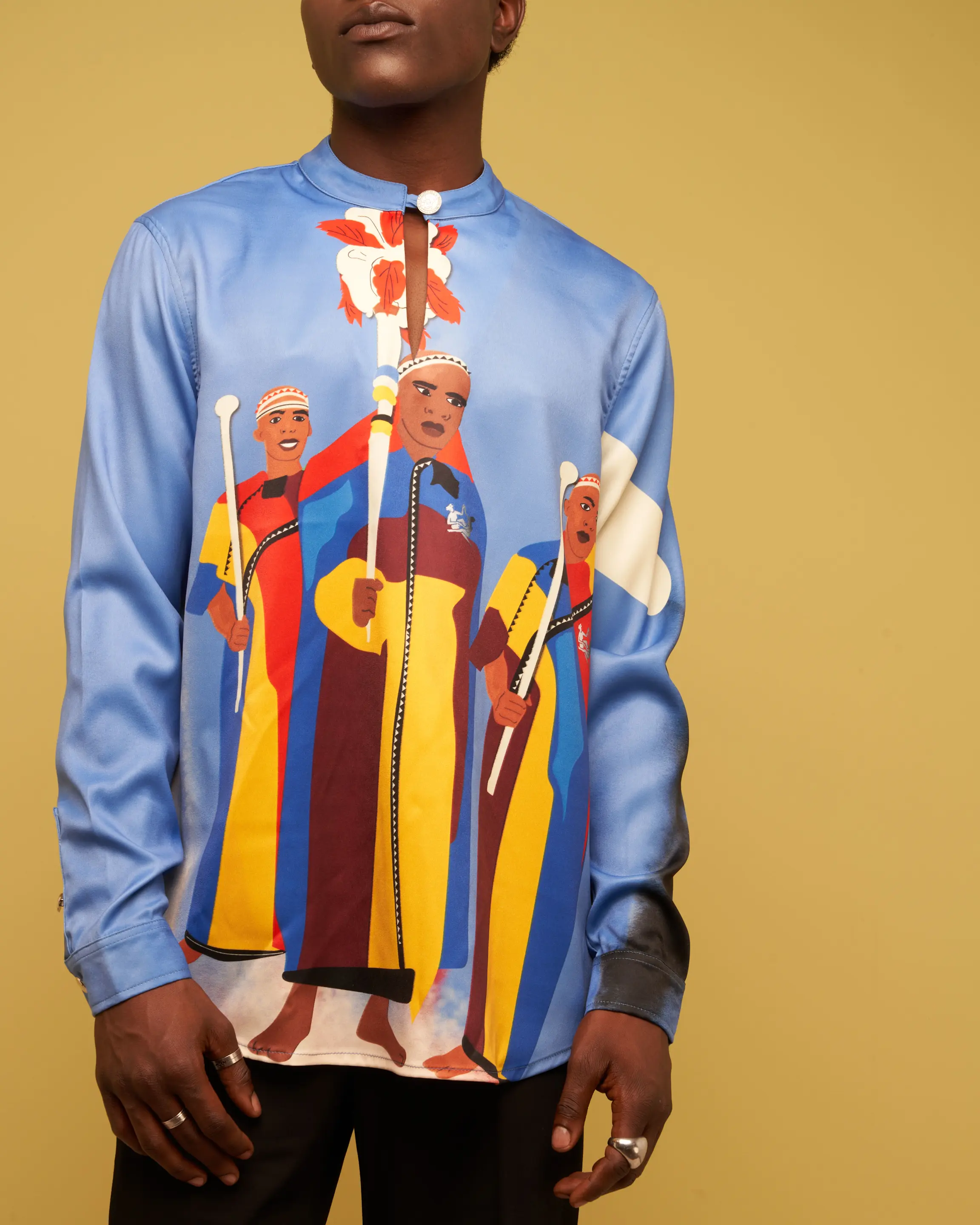 The Ndebele Lobola Heritage Shirt is cut in a straight fit silhouette with full-length sleeves and is made in a lightweight satin. The shirt features a central key-hole on the neckline that is clasped closed with a stainless steel Thebe Magugu coin button. It features a straight hem with two vents on either side of the side seam.