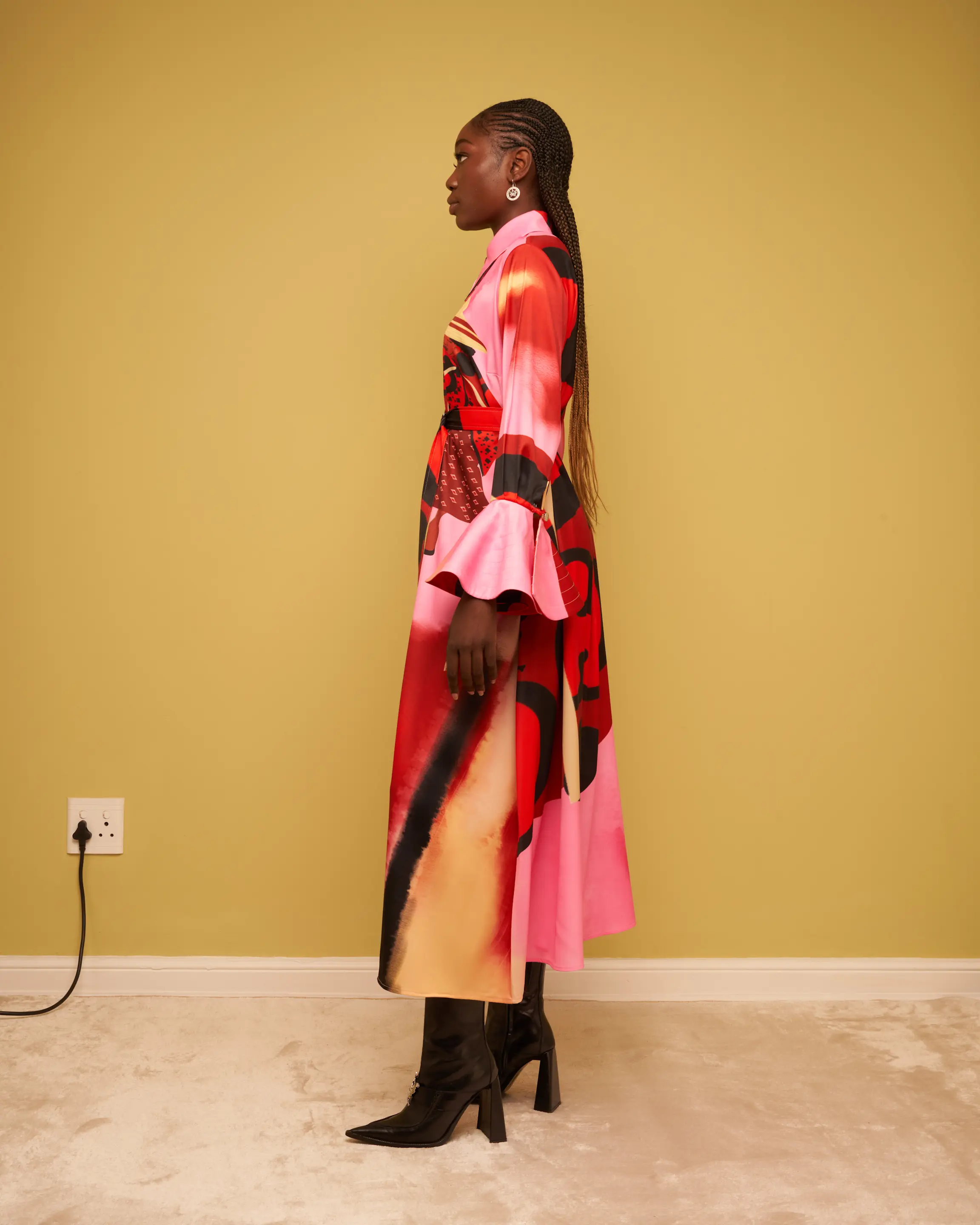 The updated silhouette for the Basotho Lobola Heritage Dress is a long-line shirt dress that features a concealed button stand, an exaggerated collar, and angel-cuffs that flare out from the high-wrist. The Lobola Heritage Dress has included a D-Ring Belt, which cinches the waist for the perfect hour-glass silhouette. The print is a celebratory look at Sotho ceremony, illustrated by artist Phathu Nembilwi.
