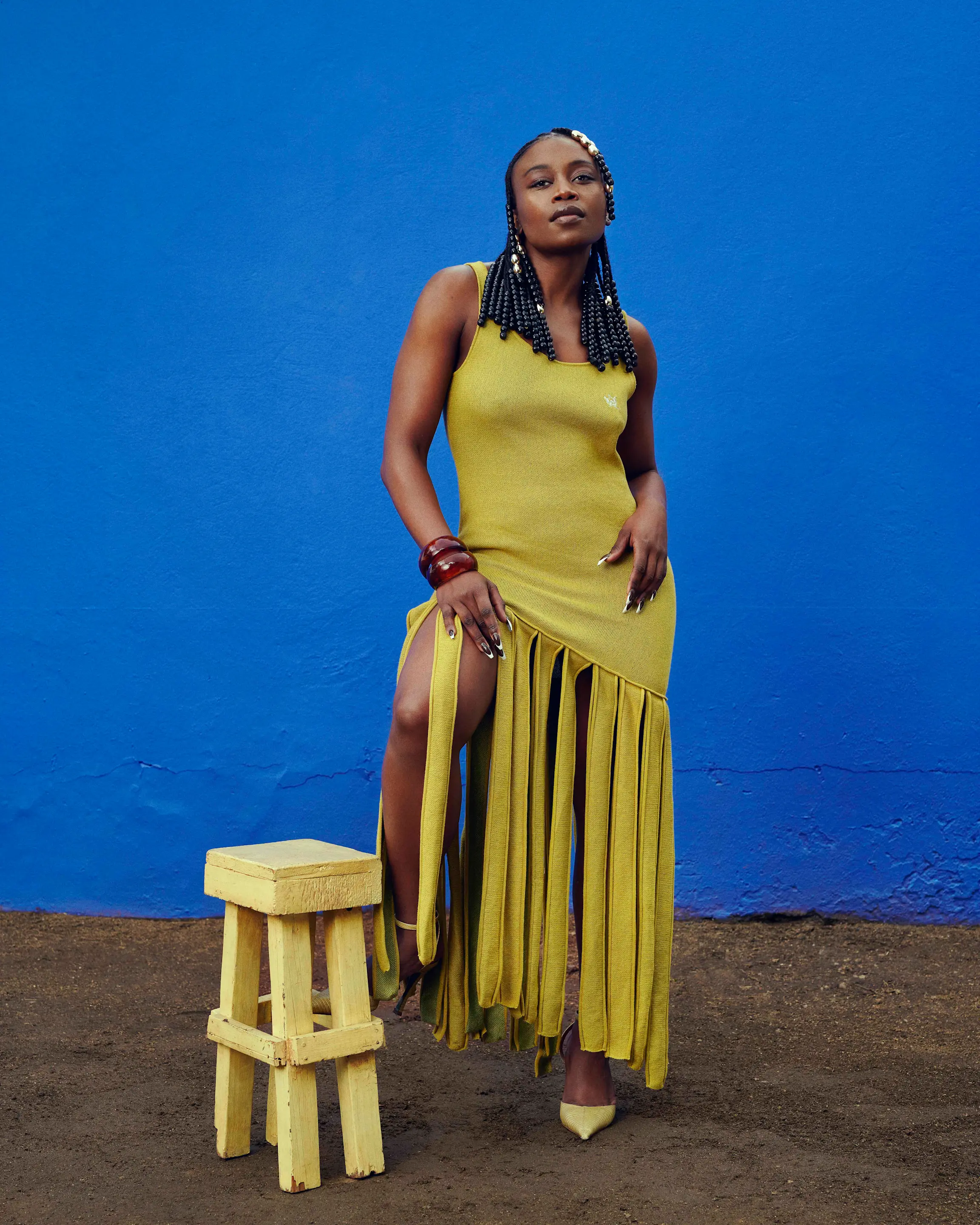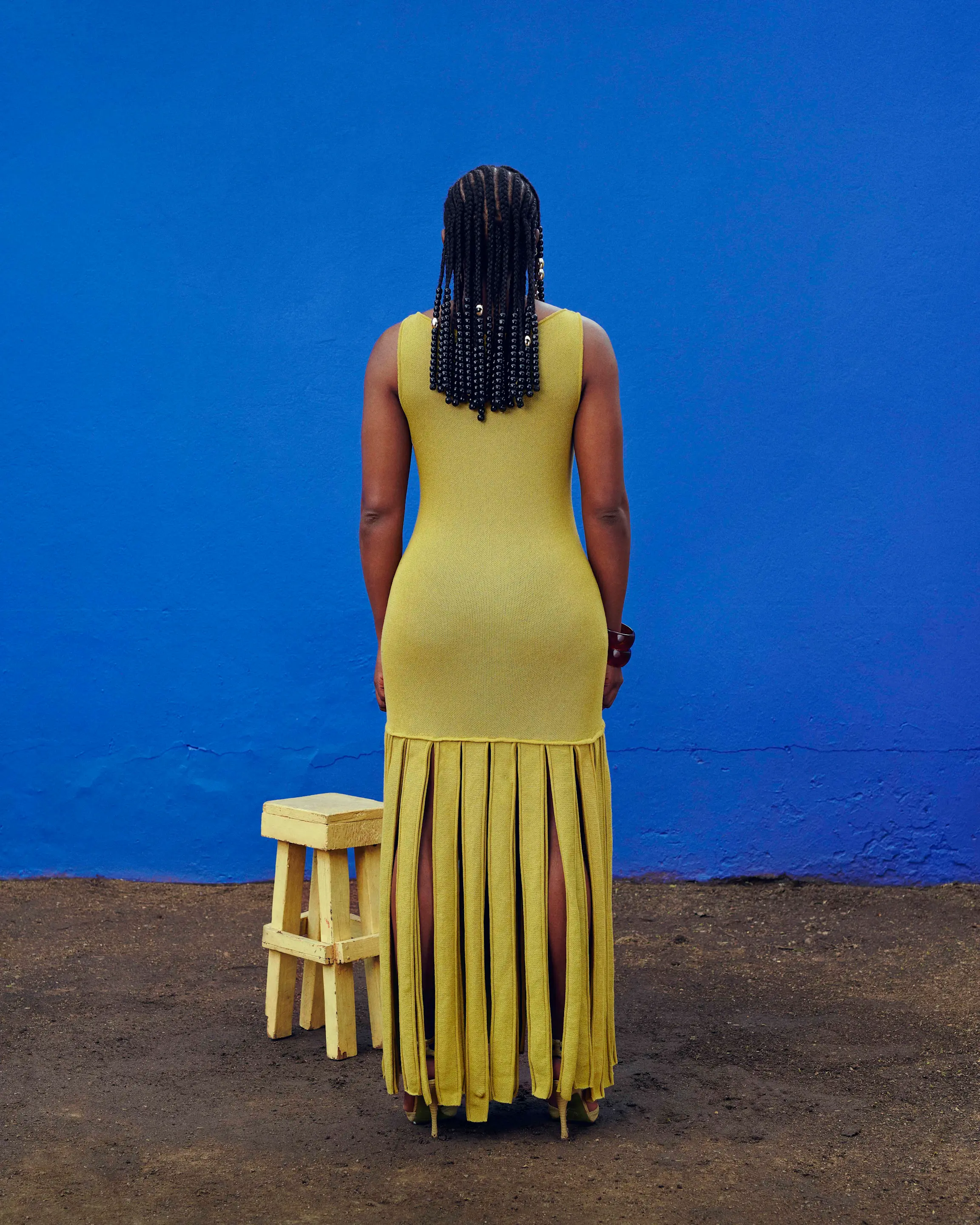 This knitted dress features a scooped neckline and fitted silhouette is punctuated with our sisterhood logo on the chest in bone white. This dress is finished with thick tassels emanating from the hem of the dress.